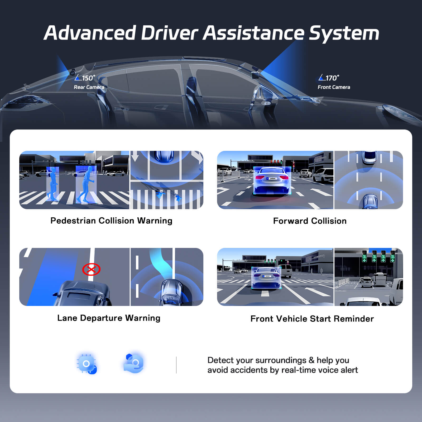 · Smart Driving Assistant: Advanced Driver Assistance System (ADAS) included proactive alerts for forward collision, pedestrian collision, lane departure warning, and front vehicle start reminder. Visual & audio warnings trigger at 0.8-2s reaction time. Your AI co-pilot for highway/city drives.