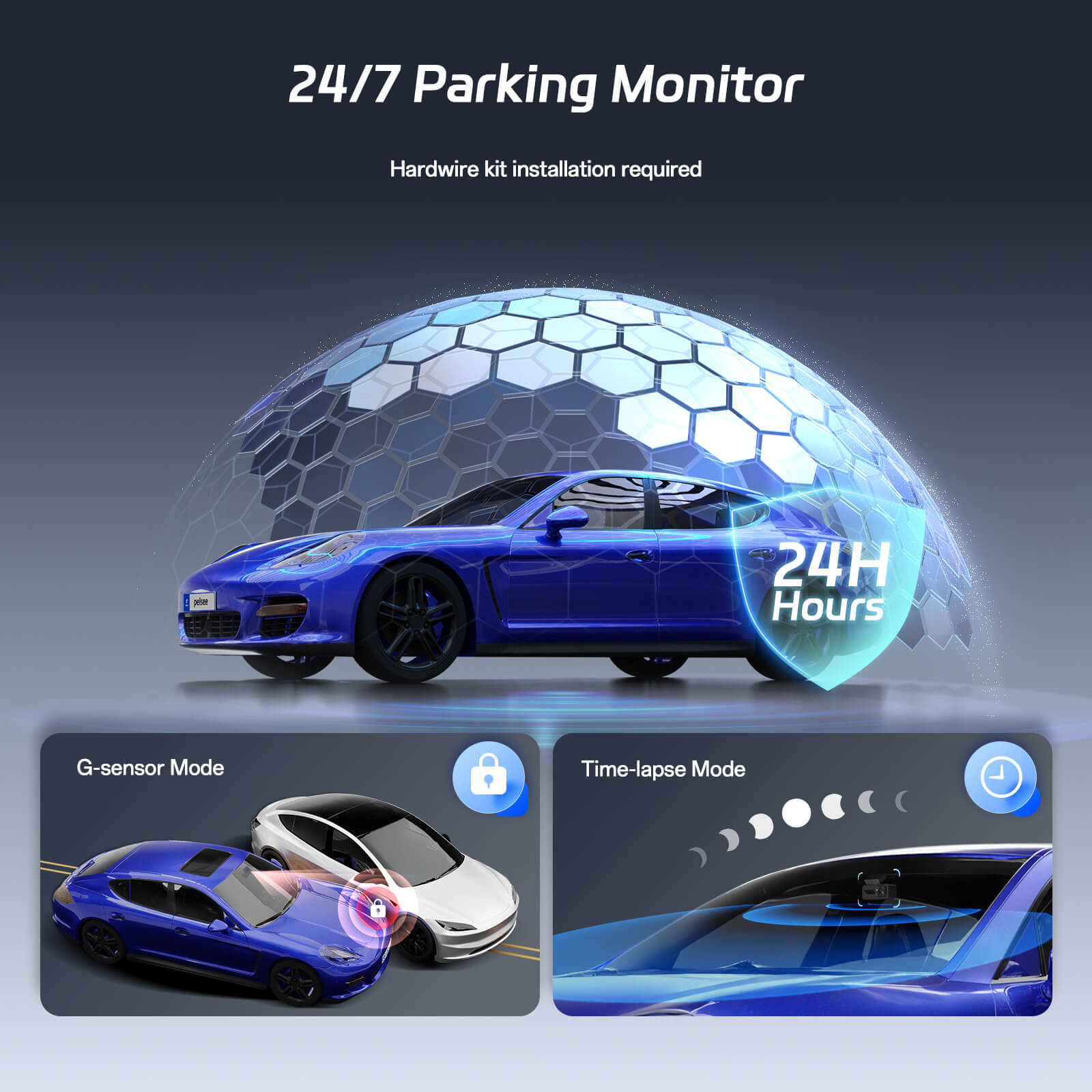· 24/7 Parking Mode: Pelsee Car Security Dash Cam offers uninterrupted protection with 24-hour parking monitoring, instantly activating via G-sensor upon impact or motion when parked. Time-lapse mode compresses hours into minutes for efficient surveillance, while seamless loop recording overwrites old footage on the pre-installed 64GB SD card (expandable up to 512GB) to ensure continuous capture.